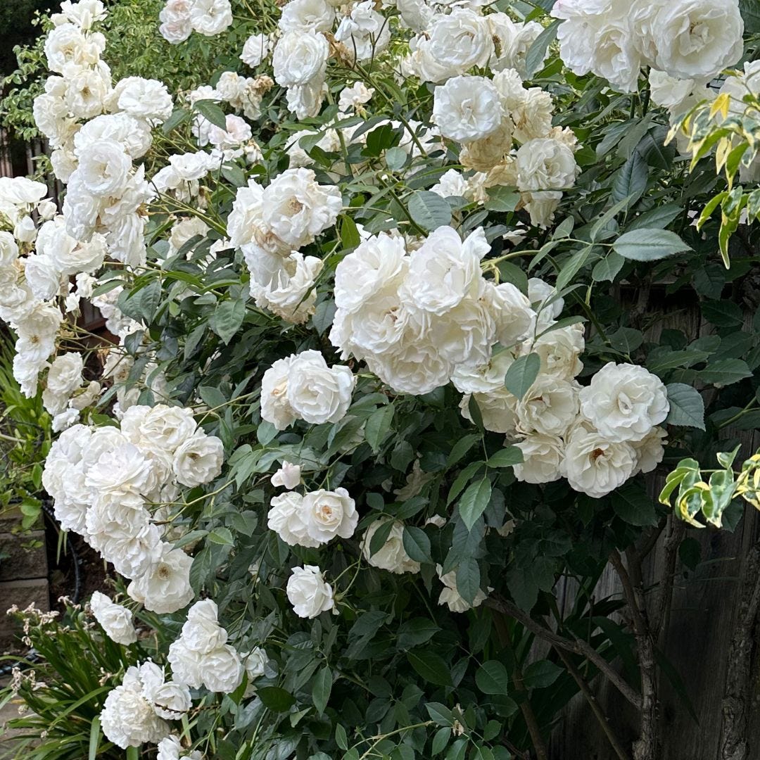So I walked outside, snapped a picture of the white iceberg roses blooming in my yard, and sent it.